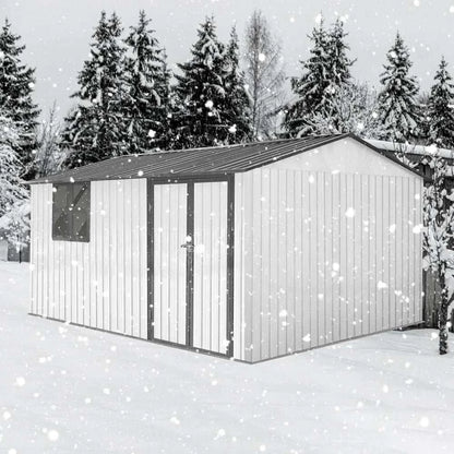 This 10x12 FT Metal Shed with window is the ideal storage solution for gardens and yards or areas with limited space. It is perfectly sized for storing bicycles, lawnmowers, barbecues, and garden tools. As with all our steel sheds, this large outdoor storage shed is constructed from galvanized steel sheets and aluminum frames.