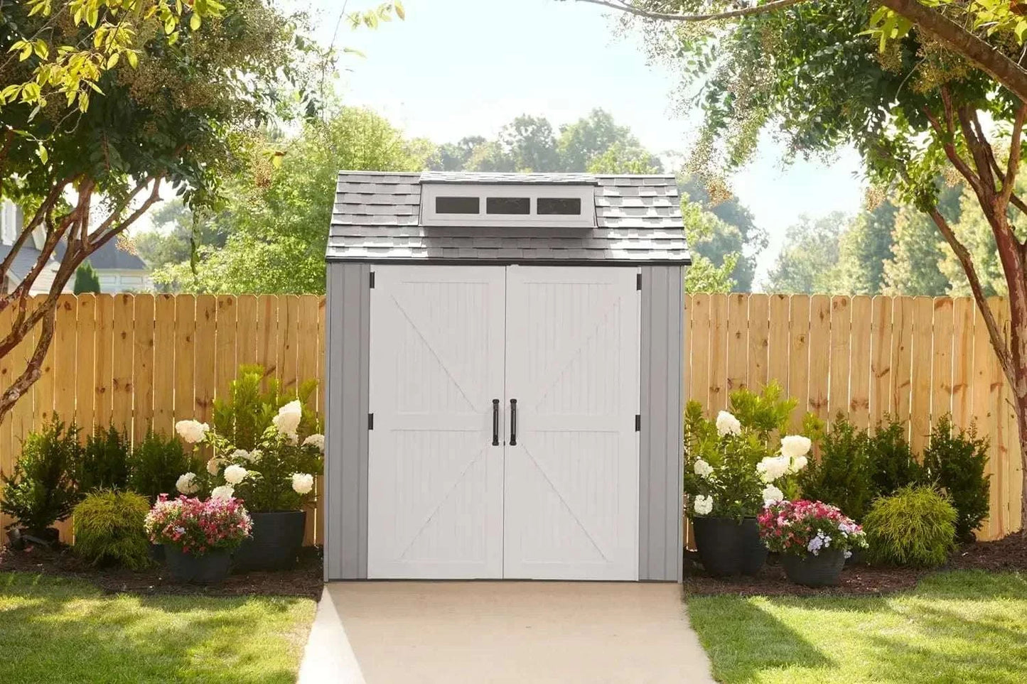 - SENSIBLE 7x7 FT Resin Shed: Outdoor 7 x 7-foot storage shed units made to store large lawn care essentials, including riding and push mowers, patio, and garden equipment, and large trash cans