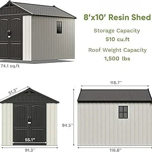 Oversized Storage SpaceOur 8x10 FT Storage Shed is designed in 116.8"D x 91.3"W x 94.5"H, provides ample storage for a wide range of items, from gardening tools and equipment to bicycles, sports gear and outdoor furniture. It will fulfill your most outdoor storage needs and is a great addition to your patio. |