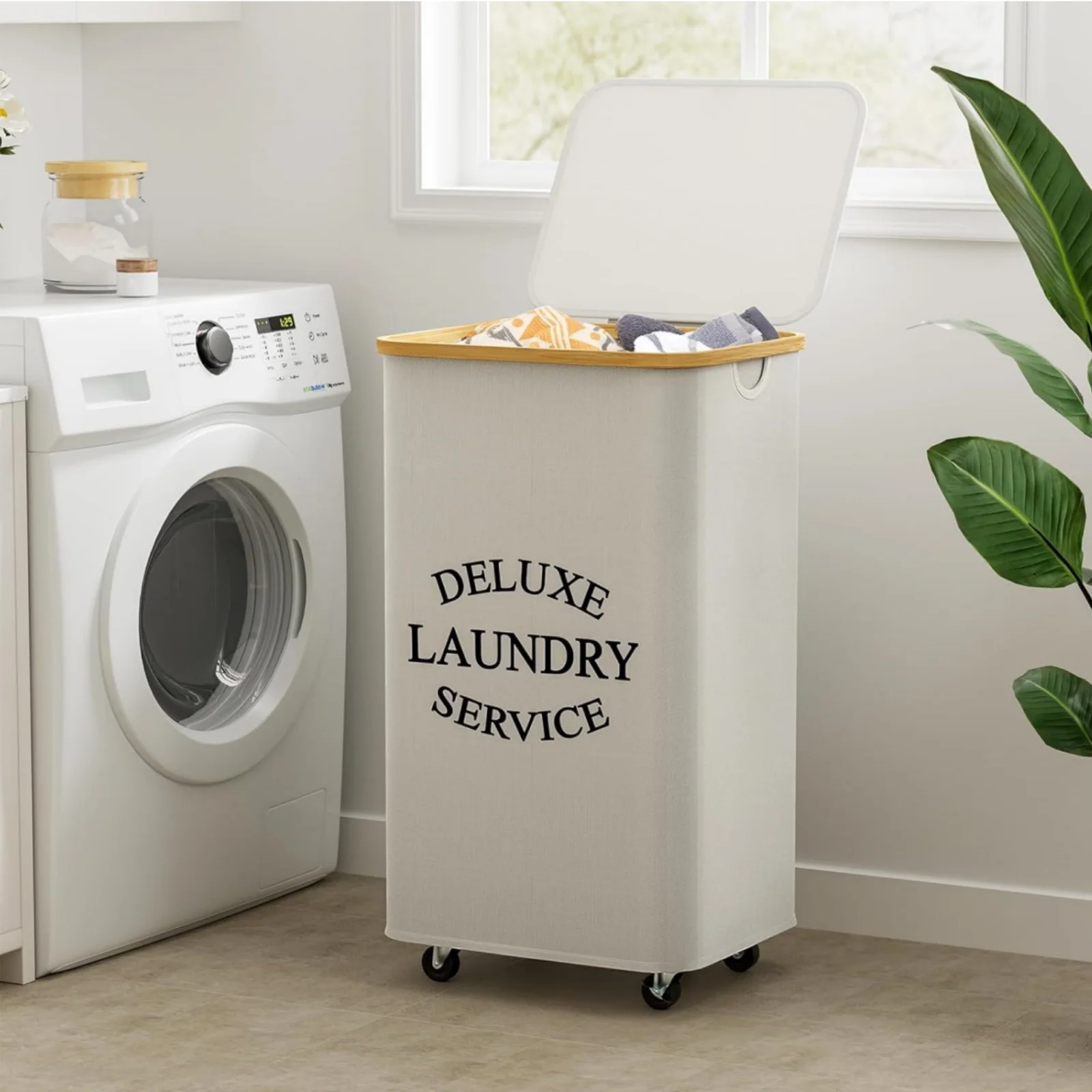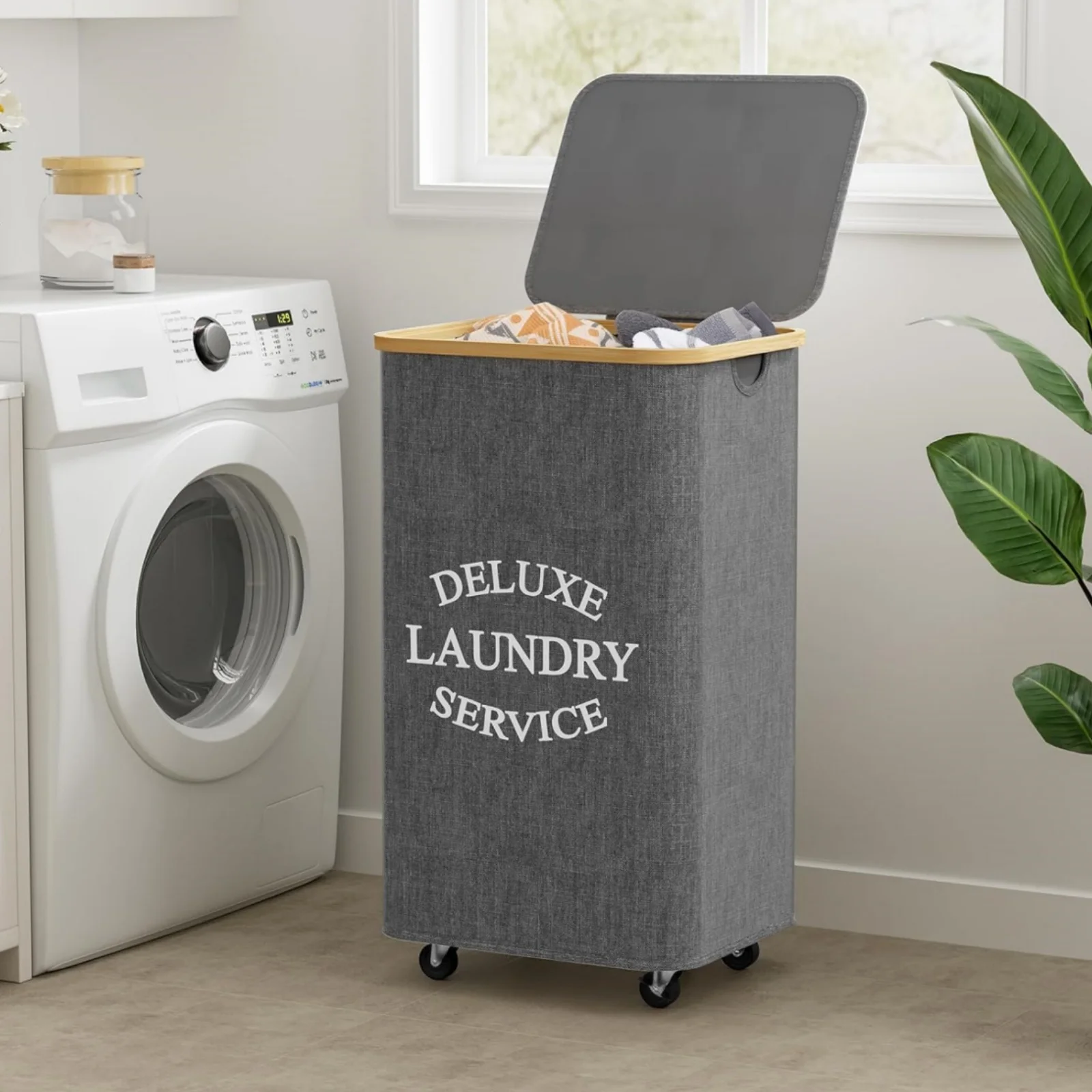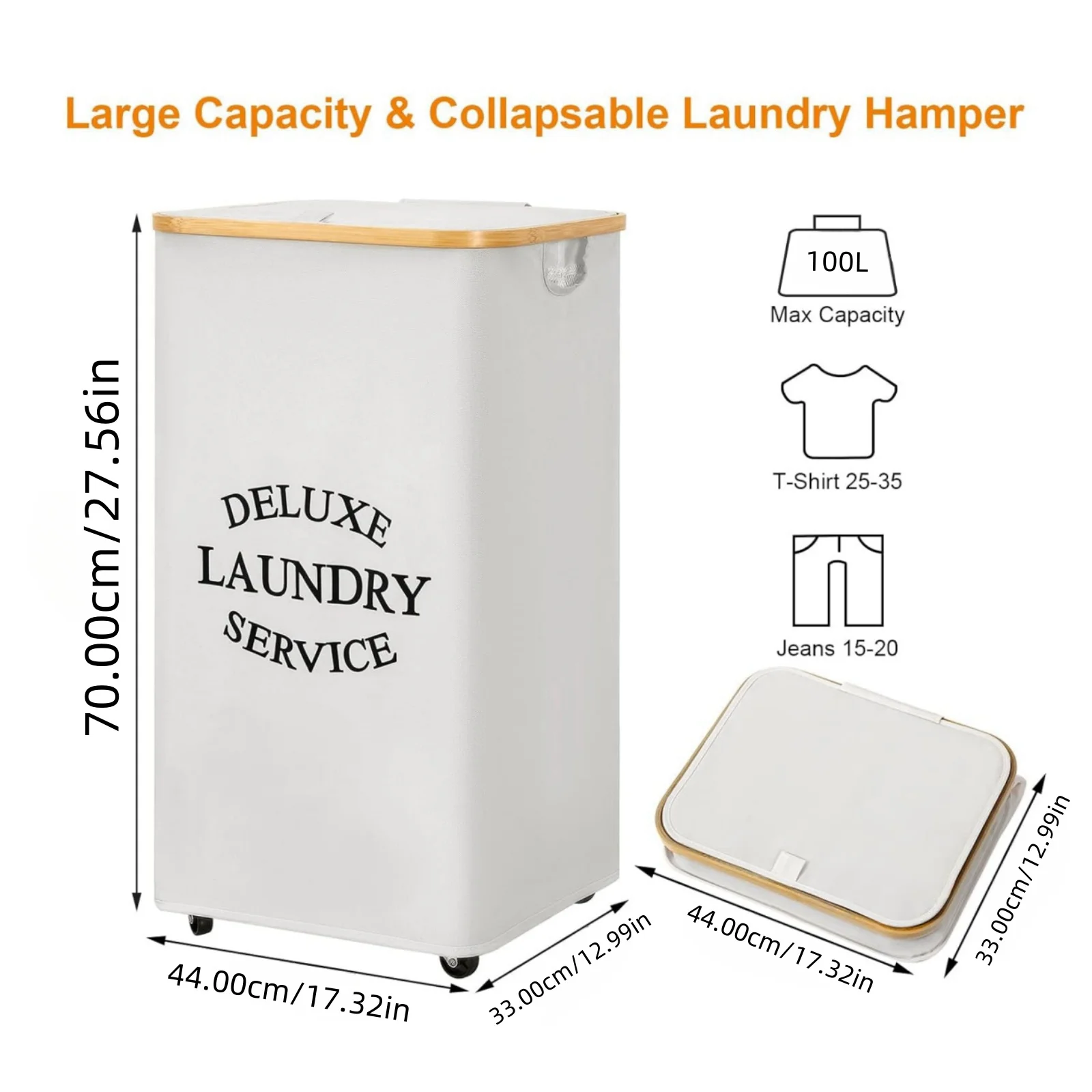 Modern Style Design: This laundry hamper boasts a sleek, modern style that seamlessly integrates into any home decor, enhancing your laundry space.,Bamboo Handle: Crafted with a durable bamboo handle, this laundry basket provides a sturdy grip, ensuring it can withstand the demands of daily use.,Chemical-Free Material: Made from chemical-free oxford fabric, this laundry basket is safe for your clothes and the environment, offering peace of mind for eco-conscious consumers.,Large Capacity: With a generous 100L capacity, this laundry basket is perfect for households with high laundry volumes, ensuring you always have a place to store your dirty clothes.,Equipped with Wheels: The inclusion of wheels on this laundry basket allows for effortless movement, saving you time and effort when transporting laundry from one room to another.