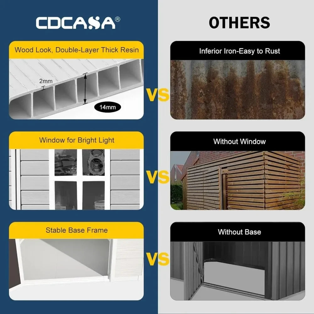 • 【PREMIUM AND DURABLE Material】The 14mm tough double-wall resin construction, 0.6 mm galvanized steel frame and impact-resistant floor are designed for long-term durability. The double-wall panels are waterproof and moisture-proof, allowing worry-free use in all weather conditions. It is weather-resistant, waterproof, and UV-resistant-no peeling, rotting, or rusting. The screws are embedded to ensure aesthetics and safety.